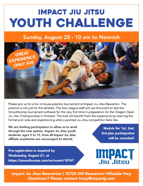 Please join us for a fun in-house practice tournament for Impact Jiu Jitsu students, ages 9 to 15. The event will take place at Impact Jiu Jitsu in Beaverton, beginning at 10 am and finishing…